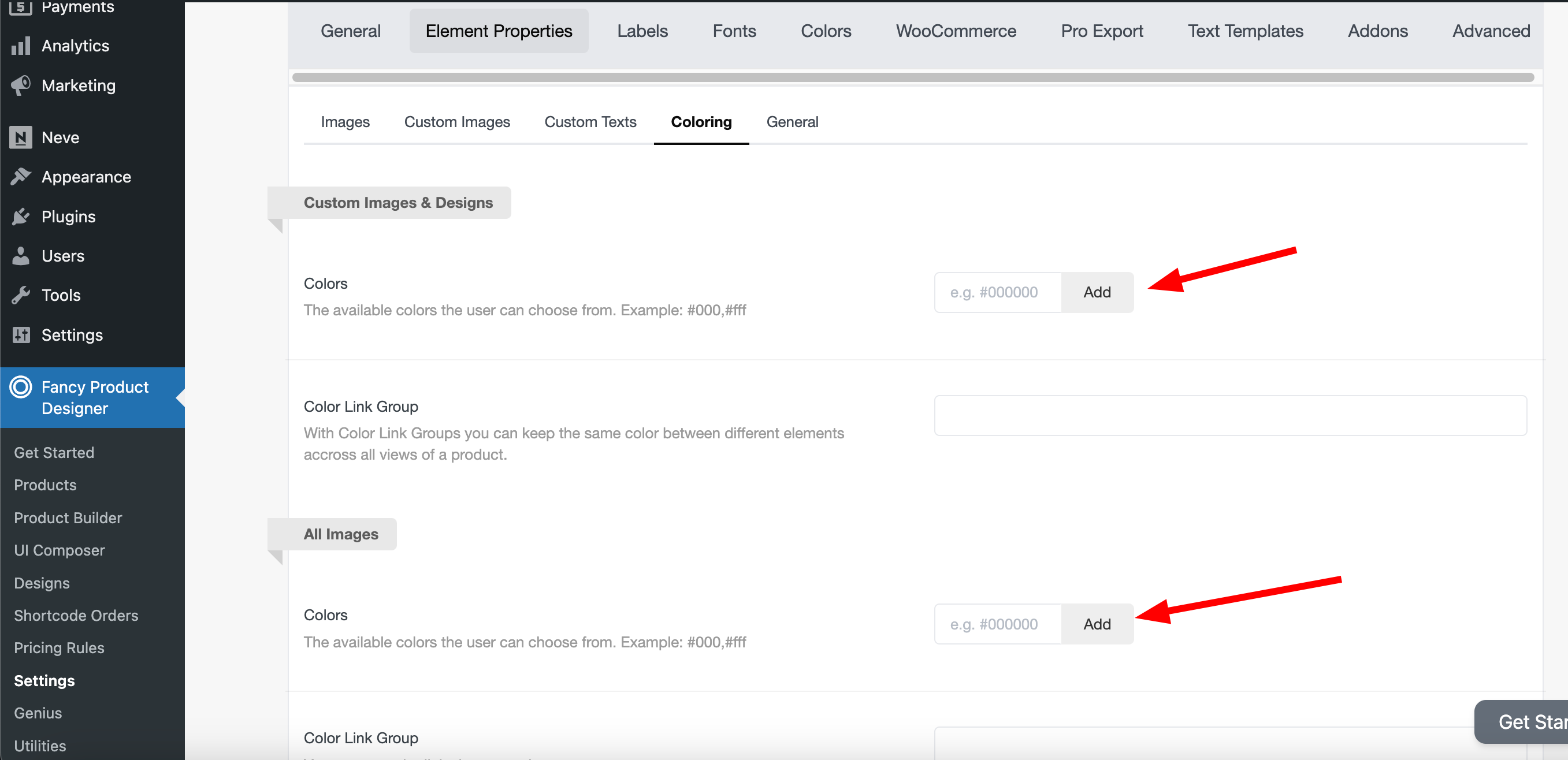In order for the color option to show, you need to go to Fancy Product Designer > Settings > Element Properties > Coloring: